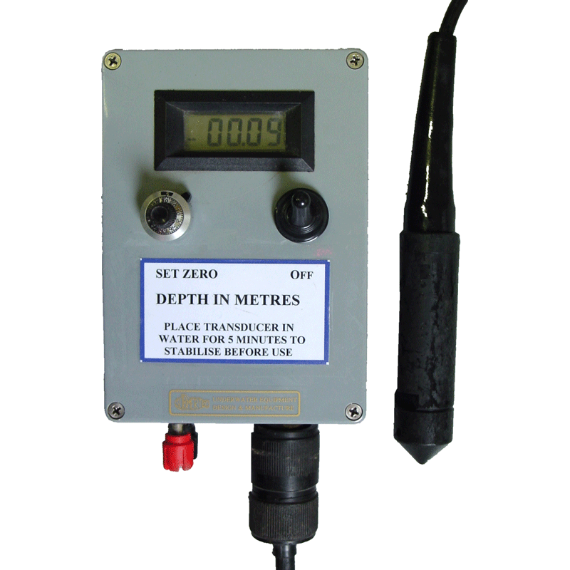 An easy to use and rugged digital depth measuring system consisting of a high accuracy pressure probe, underwater cable and hand held battery operated display unit which is ideal for operation from small boats, pontoons, docks etc.
