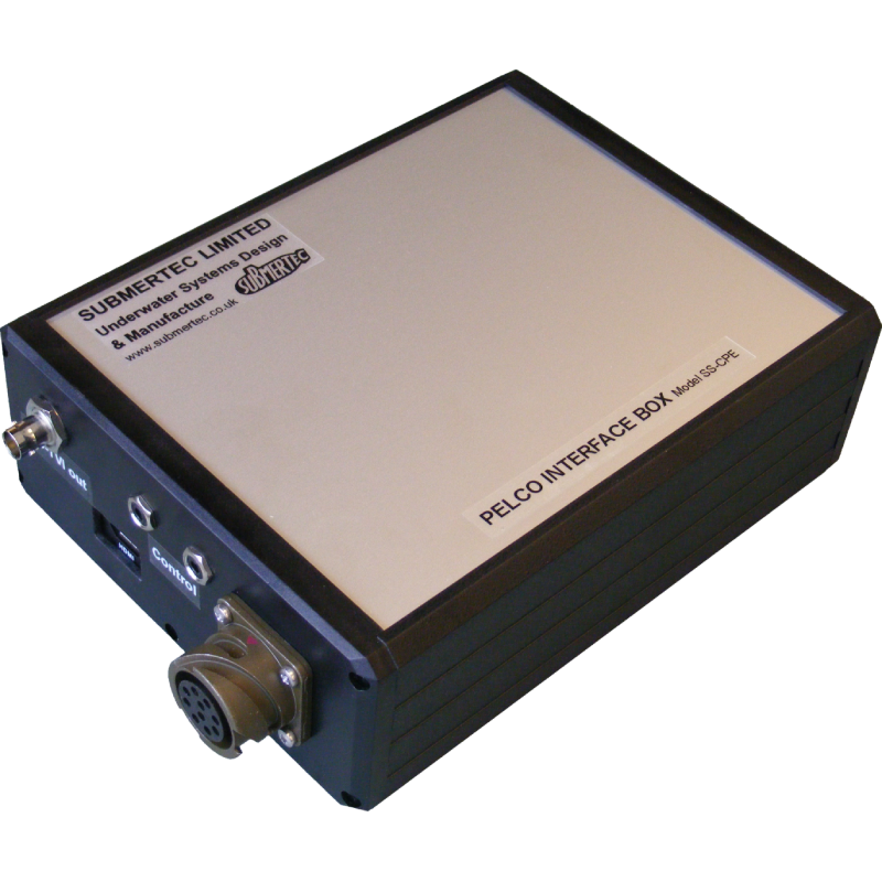 A Submertec interface board inside the box provides baud rate conversion between control input and camera output to allow operation from a wide range of controllers. It also provides an identification number for use in multi camera systems.